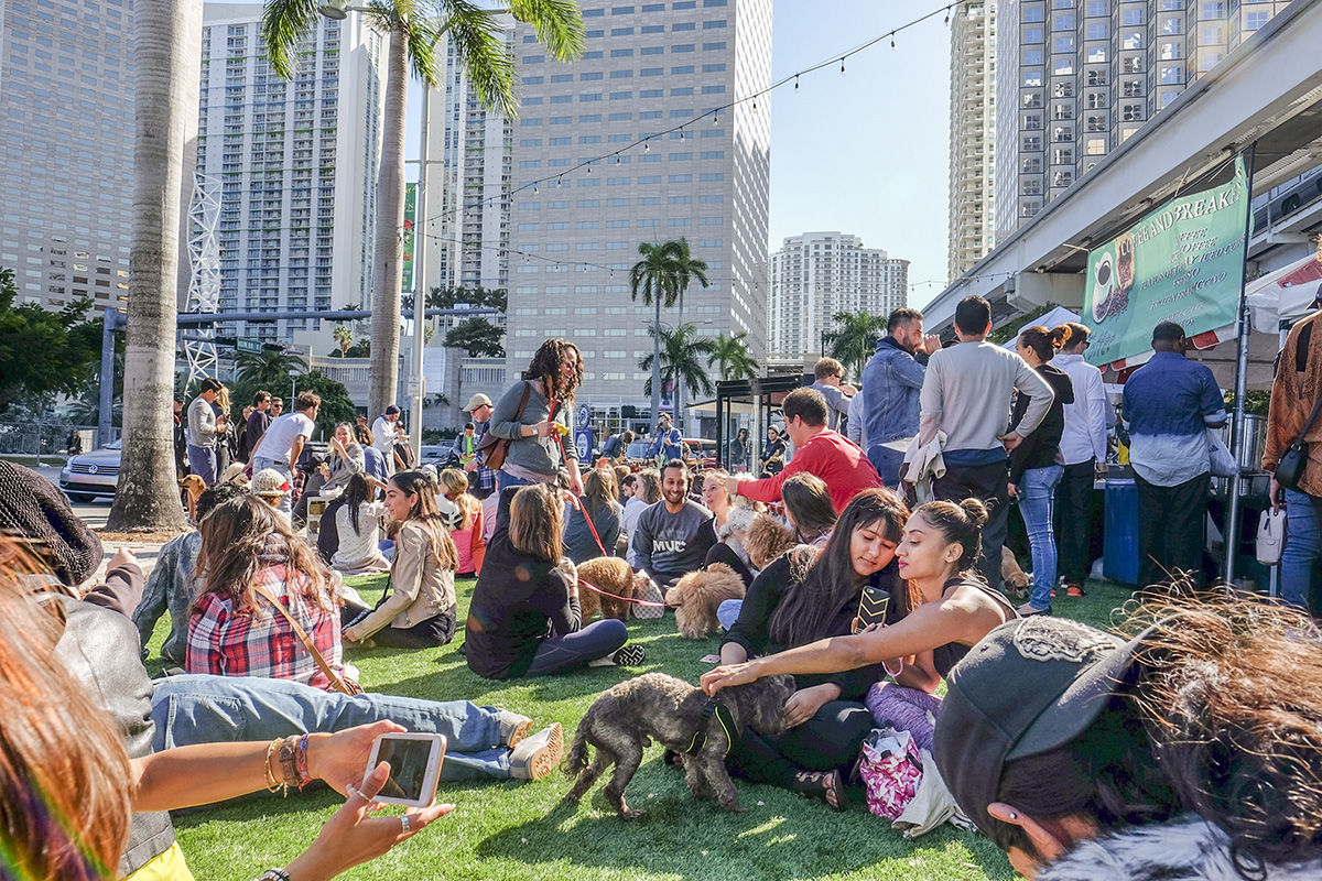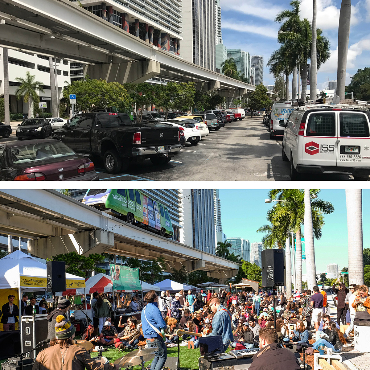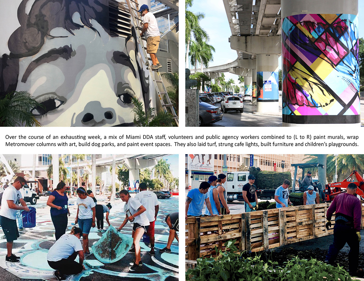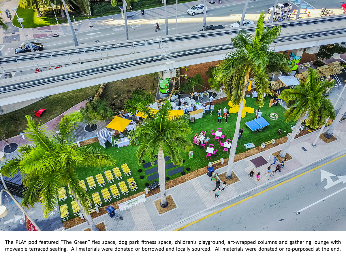 In 2017, with support from the Knight Foundation and the Miami Foundation, the Miami DDA created a one-month temporary installation within 2 parking bays in the median of Biscayne Boulevard and 1 Metromover Station, reimagining the boulevard and creating a new active public space for the enjoyment of Downtown Miami residents and visitors. The installation provided both recreational and passive amenities, fun and interactive elements, as well as events for guests of all ages, both day and night, allowing people to gather and connect. The demonstration project featured 26 free community events, hosted over 20,000 visitors, and provided residents and businesses a sneak peek into the future of Downtown Miami and build the necessary support for the long-term vision.