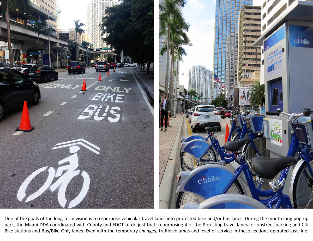 In 2017, the Miami DDA and the City of Miami were awarded a $420,000 Transportation Alternatives Program (TAP) Grant from the Florida Department of Transportation (FDOT) to conduct a Lane Elimination Analysis. This study has examined repurposing vehicular travel lanes into protected bike lanes and possible transit-only lanes, converting the interior parking bays into a pedestrian promenade/green space, and implementing enhanced crosswalks and intersections.