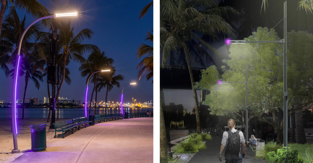 Numerous waterfront sites do not feel welcoming or safe, particularly at night, due to a lack of lighting. There is little consistency in the utilization of furnishings or materials, nor unifying elements that connect and create a Baywalk/Riverwalk identity. The first element of the Waterfront Walkway Design Standards that addresses both these issues are custom-designed lights. The image to the left is the Louis Poulson Baywalk light with a curved LED light strip in the pole. The image to the right is the Louis Poulson Riverwalk light based off of the masthead of a ship with an LED beacon. The lights are fully programmable via a Bluetooth app and can change colors for any occasion.